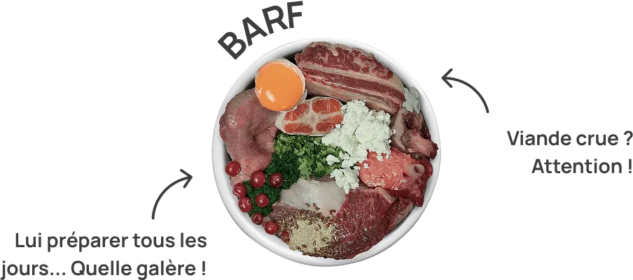 Les deux sont des alimentations naturelles et saines pour chien, cependant, l'alimentation BARF est crue, et les recettes Dogfy Diet sont cuites à basse température, ce qui les rend plus sûres. Nous éliminons ainsi les risques bactériologiques liés à la viande crue, tout en améliorant sa digestibilité.